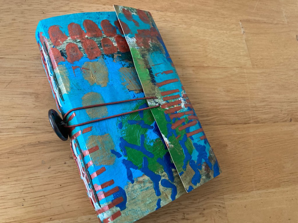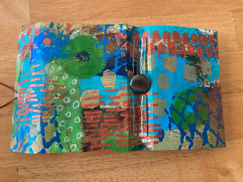 To create the cover design I used acrylic paints, stencils, and some foam stamps. Then I stitched in the signatures (pages) using a chain stitch. That was a new technique for me. Clearly. ha ha