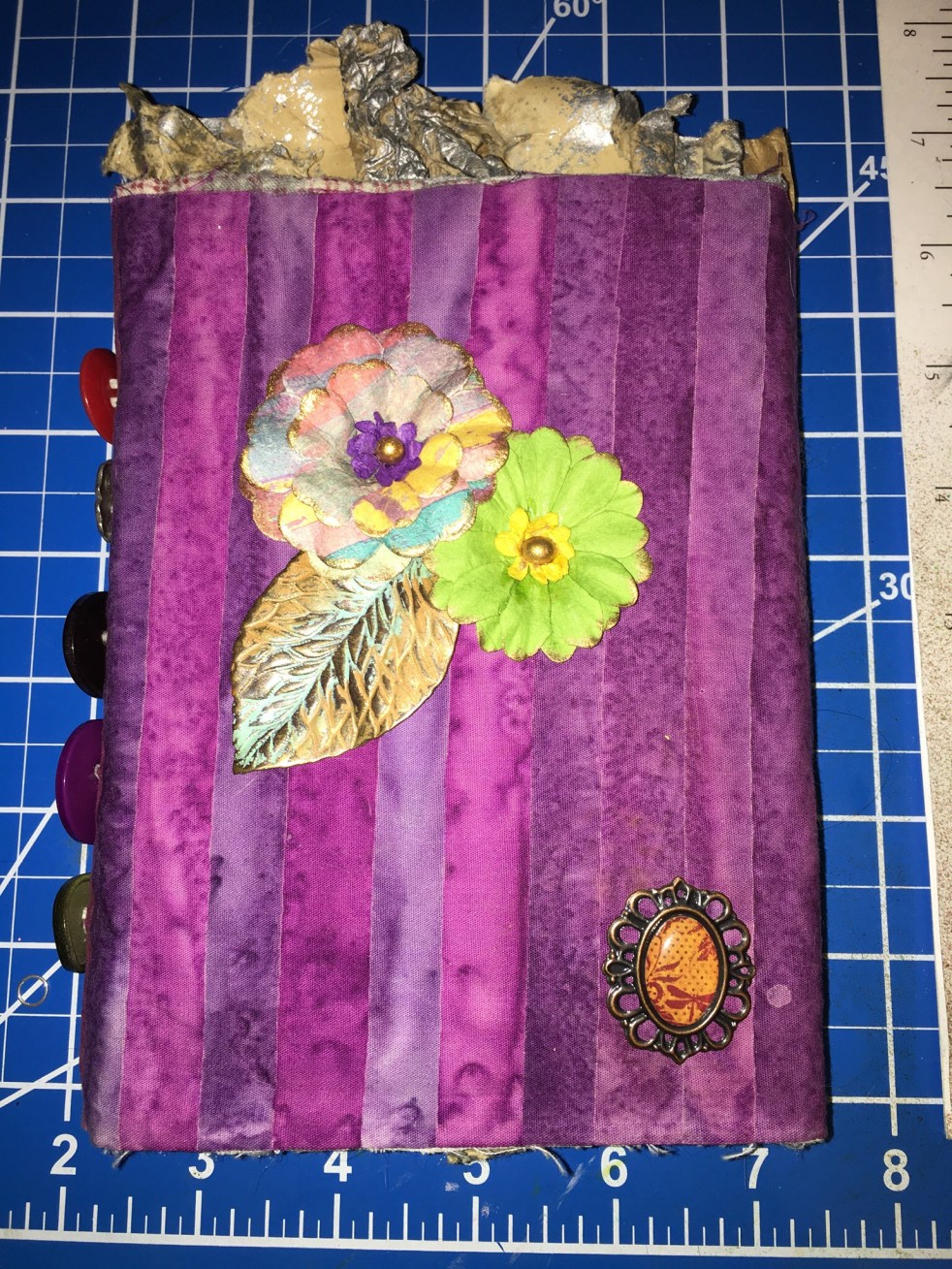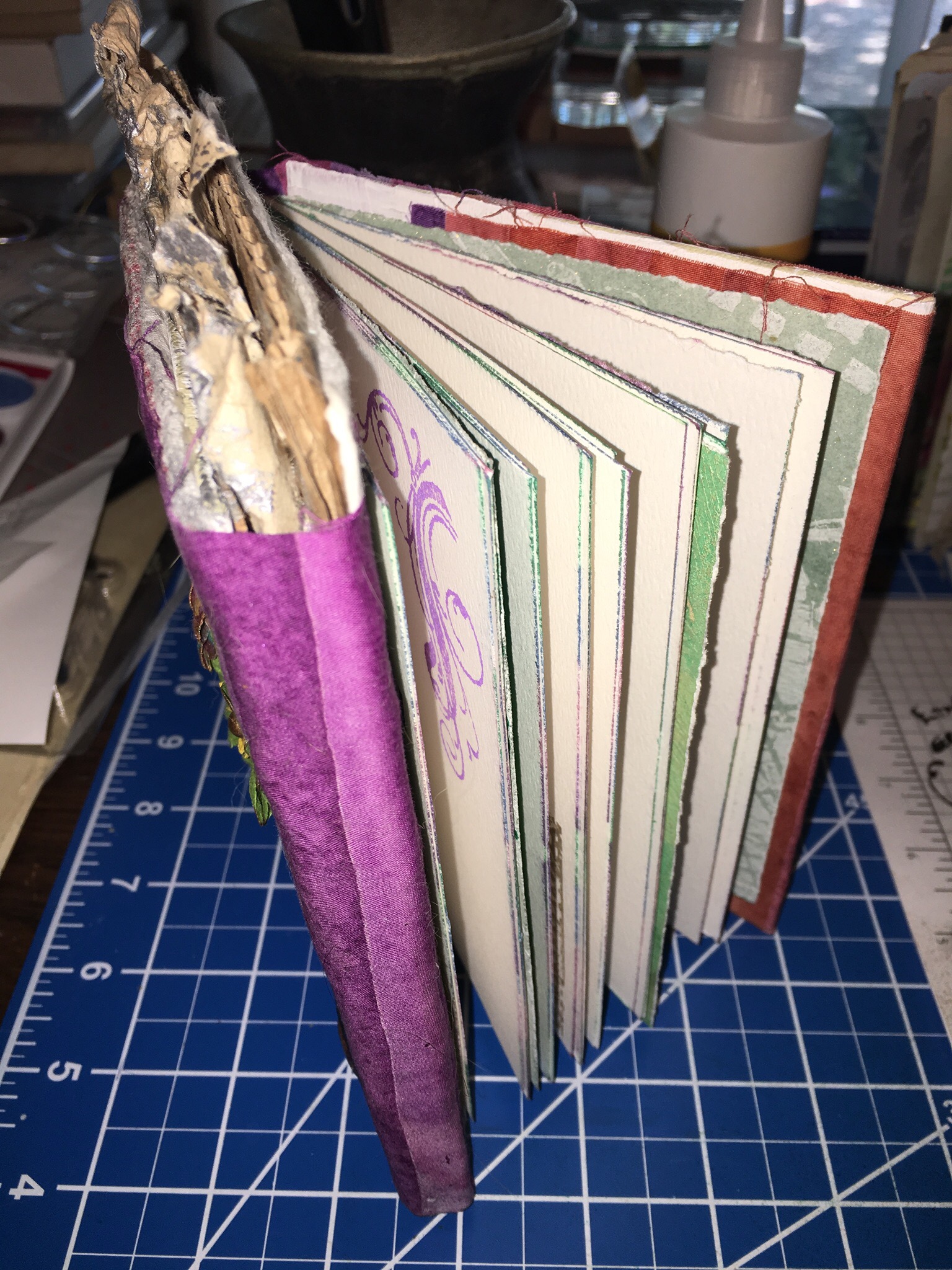 The passport I used came from an Israeli woman. I bought the thing on eBay. Because of its origin, the passport read backward from the way we do in English. That gave some additional character to this project. I inserted recycled pages, found objects, tea dyed pieces, tags, tea bags, old postcards, stamped paper, painted paper, fabric, and a host of other objects into this now bulging passport. Somewhere along the line I started calling the book “Erna” after the original owner of the passport. I often wonder what she would think of the way her passport looks now, and of the technology I’m using to share this artwork with others.